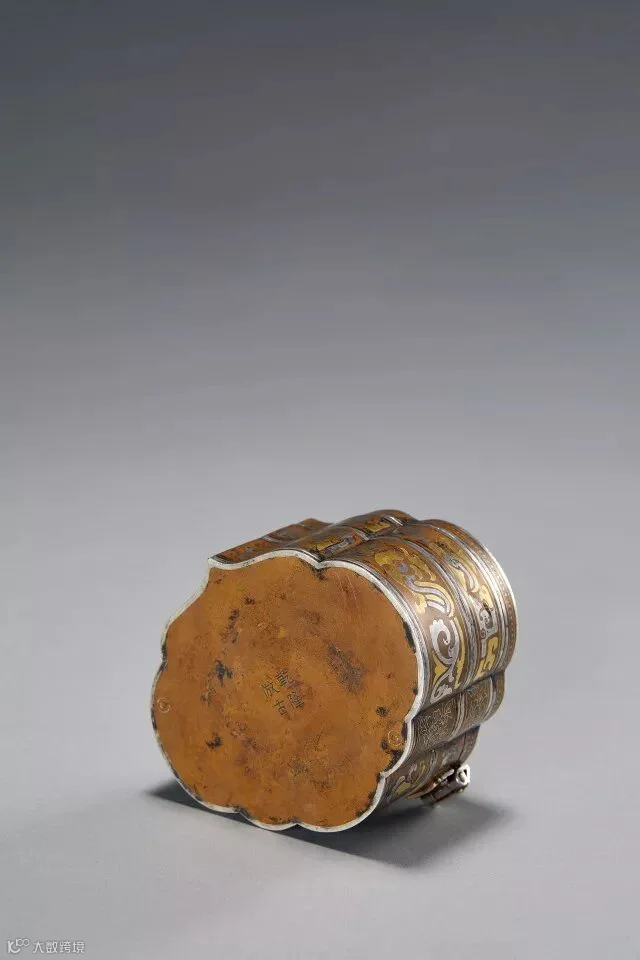 盒蓋、盒身兩層邊緣,皆包銀邊。盒身上層固定,內膛較淺,打開蓋部,可見此層內附著錦緞裡。盒身下層較深,由側邊斜拉而出,分為兩屜。外部以錯金銀片和錯金銀絲,分別裝飾鳳鳥紋和牡丹紋,舒展飄逸,富貴華麗。底部有刻款楷書“乾隆仿古”四字。銅器鑲嵌松石由來已久,可追溯到二裏頭文化時期。春秋晚期,青銅錯紅銅、錯金銀開始出現。在漢代,鑲嵌綠松石、錯金銀達到頂峰,絢麗多彩。此件在造型和工藝上直達古意,紋飾圖案化,有大漢之風,而鳳凰牡丹紋又是元明以來瓷器中常見的紋飾。這種擇取古代多朝元素混合的精美之作,正是乾隆摹古器的壹大特征。