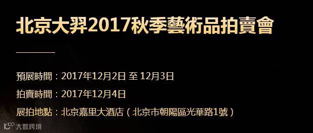 由北京大羿拍卖有限公司举办的2017秋季艺术品拍卖会于2017年12月2-3日在北京嘉里大酒店举行预展,于12月4日举行拍卖会。
