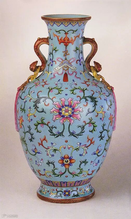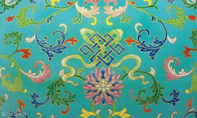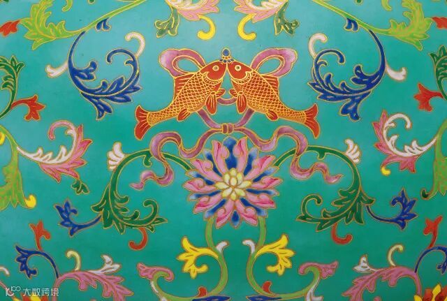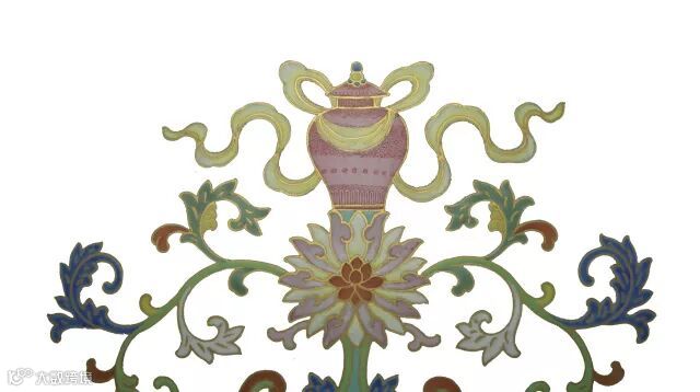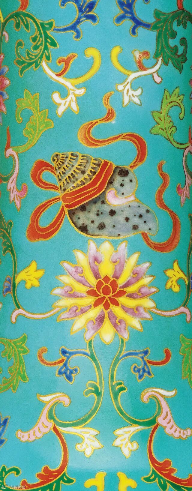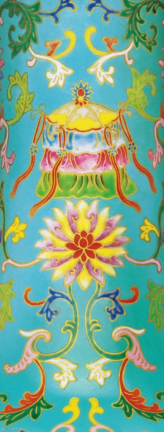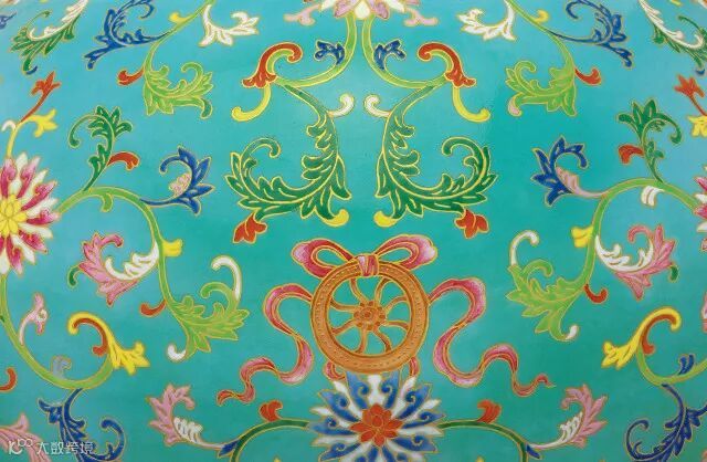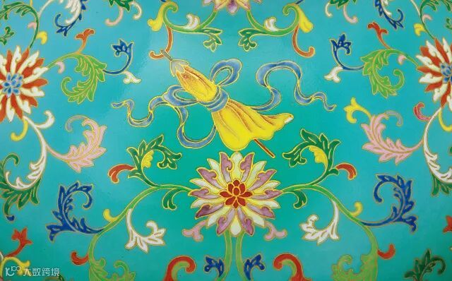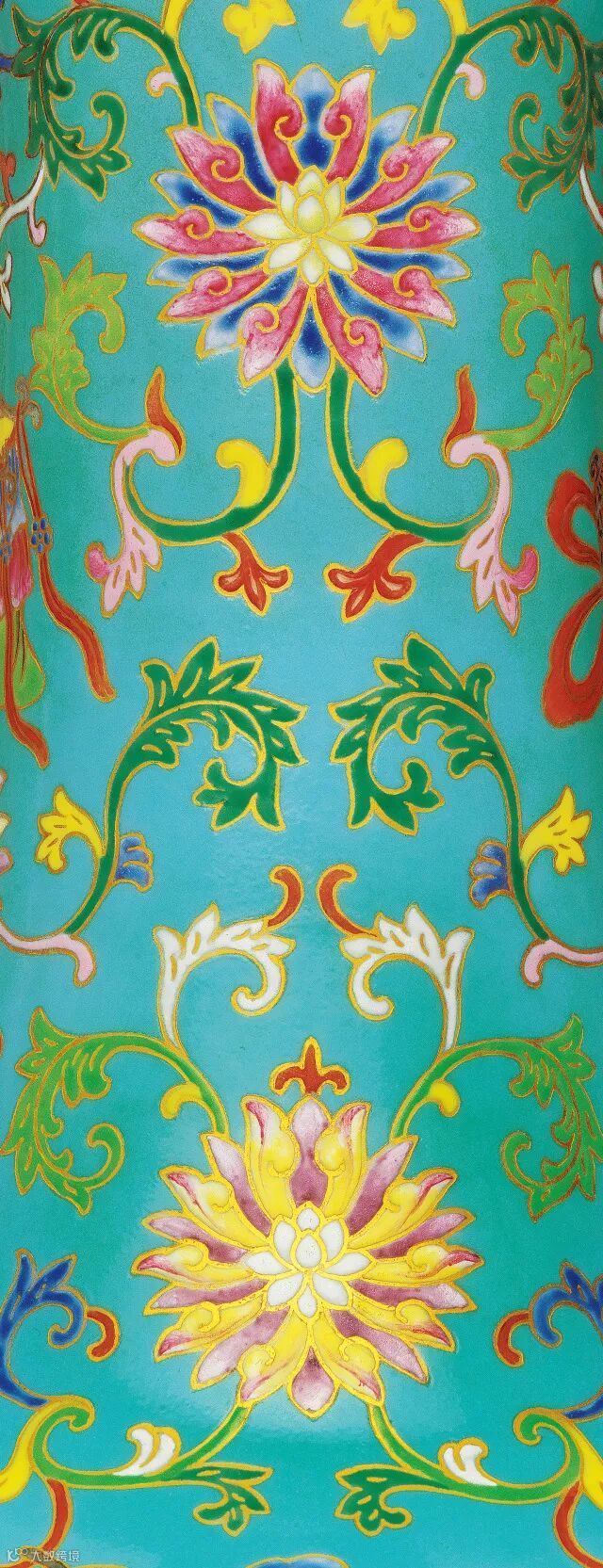 其枝蔓婉转翻卷,设色随之变换,展现丰富多彩的华丽,流露出典型的巴洛克式装饰风格。整体布局均衡,填色精准,红彩纯正匀净,绿彩娇嫩青翠,黄彩明快润泽,诸彩交映出淡雅柔和、臻于至美的内廷恭造风格。