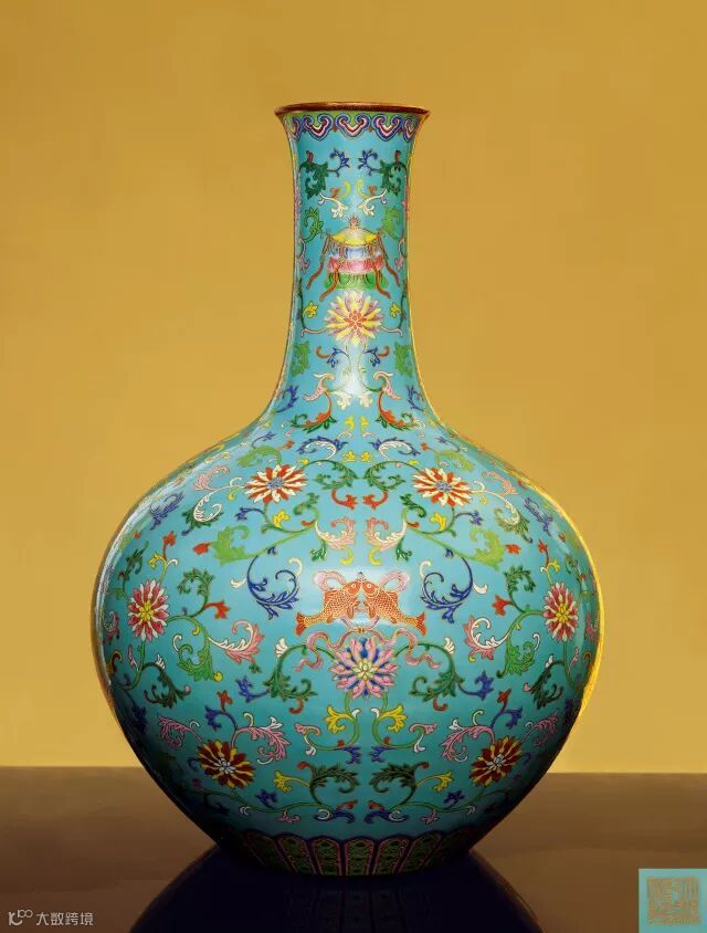 此瓶微撇口,长颈,鼓腹,假圈足。外壁以松石绿釉为地,口沿一圈如意云头纹,底足一周变体莲瓣纹,通体以粉彩間以洋彩饰折枝宝相花八吉图案,体现出极丰富的想象力与设计感。底松石绿地以金彩书『大清乾隆年制』六字三行篆书款。