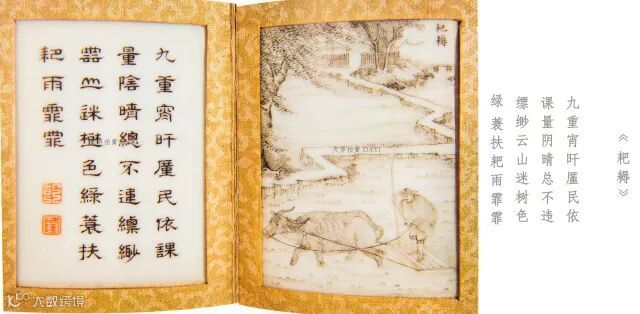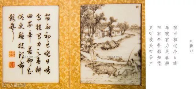 翻阅典籍资料,乾隆时期有瓷制墨彩题诗耕织图册,是为清宫旧藏(《故宫博物院藏御制诗陶瓷器》,故宫出版社,2016年12月,页220,图73)。此图册由92张瓷板镶嵌而成,一套四册,紫檀木封面及封底,以墨彩绘耕织图共46幅,每图配有一首墨彩书乾隆御题诗《恭读皇祖圣训仁皇帝御题耕织图四十六景诗敬和原韵》,诗后均钤“乾”“隆”两方红彩印章。