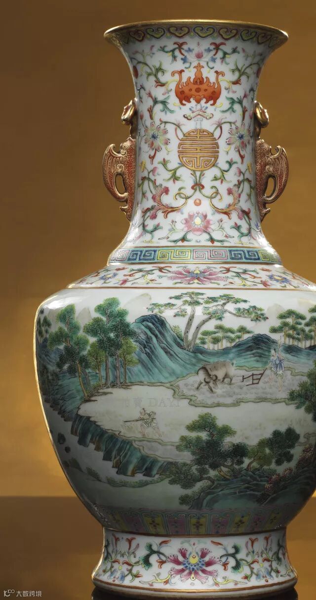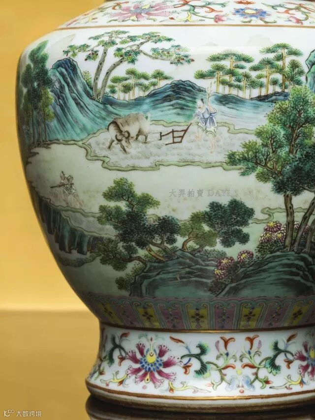 此瓶撇口,长颈,斜溜肩,腹部向下收敛,足外撇。口沿饰如意云头纹,颈部、肩及足部皆粉彩绘缠枝花卉,正面红彩绘蝙蝠金彩书寿字,两侧饰红彩双蝠衔枝耳,腹部洋彩绘通景耕织图,正面绘一农夫耙地,旁有一牛立于田埂上;背面绘一农夫用牛犁地,另一农夫在远处耕作,远山近树,骄阳流云犹如一幅民间风俗画。