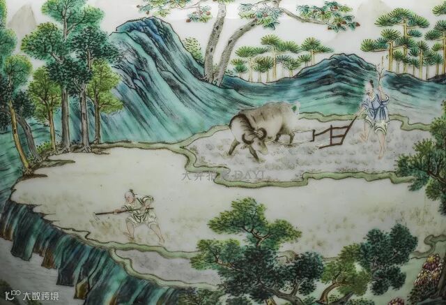 经比较,此拍品图所绘与乾隆时期瓷制墨彩题诗耕织图册中的《耕》及《耙耨》两图中农民及农耕用具基本一致,因此判断此拍品【清乾隆·洋彩通景耕织图双蝠衔枝耳瓶】所描述的即为这两番场景。