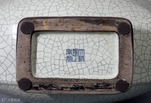 從傳世品看,米色仿哥為米黃色大開片內嵌套黑色小開片,粉青則為僅開細密的黑色片紋,本器屬於前者。