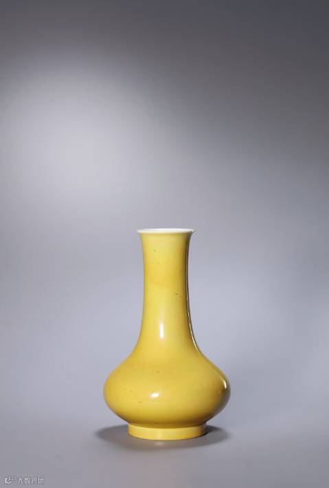 此瓶微撇口,直頸,溜肩鼓腹,圈足。外壁施以雞油黃釉,底青花書“大清康熙年制”六字三行楷書款。本品造型線條完美,比例合宜,協調美觀,大方雍容,純美端莊,是為不可多得的皇家用品。
