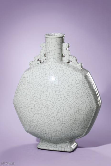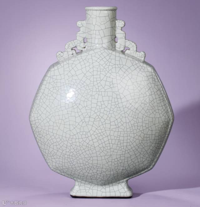 此瓶直口短頸,口沿起唇,頸部飾單線紋,兩側裝飾螭龍耳,腹部呈八角扁平狀,方足外撇。通體施仿哥釉,光素無紋,底青花書“大清雍正年制”六字三行篆書款。雍正壹朝雖僅十三年,然瓷藝精進,達到清代制瓷之頂峰。又因雍正皇帝學養深醇,追求器物的至善至美,對顏色釉瓷器情有獨鐘,故單色釉壹項更是名品叠出,多為後世稱頌與寶藏。本品正是雍正禦瓷創設之逸品。