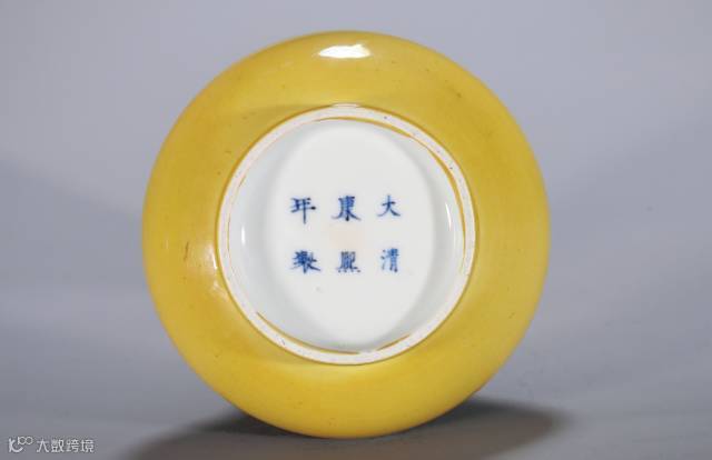 此洗敞口,斜壁,假圈足,玉璧底,底中心施白釉青花書“大清康熙年制”六字三行楷書款,內外光素無紋勻施綠釉。此洗小巧精致,胎質堅致細薄,造型纖巧玲瓏,古趣盎然,為文人所寶。