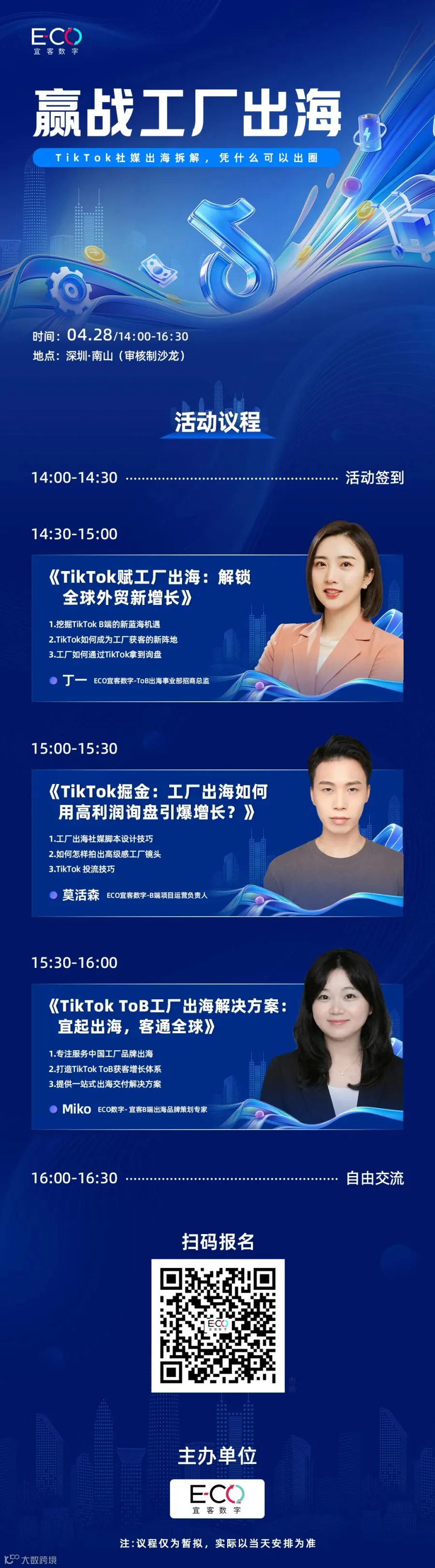 为帮助更多已入局的外贸工厂破解 TikTok 增长瓶颈,打通从 “流量曝光” 到 “高利润大额订单” 的全链路闭环,ECO宜客数字重磅打造「赢战工厂出海」TikTok 社媒出海深度闭门沙龙。