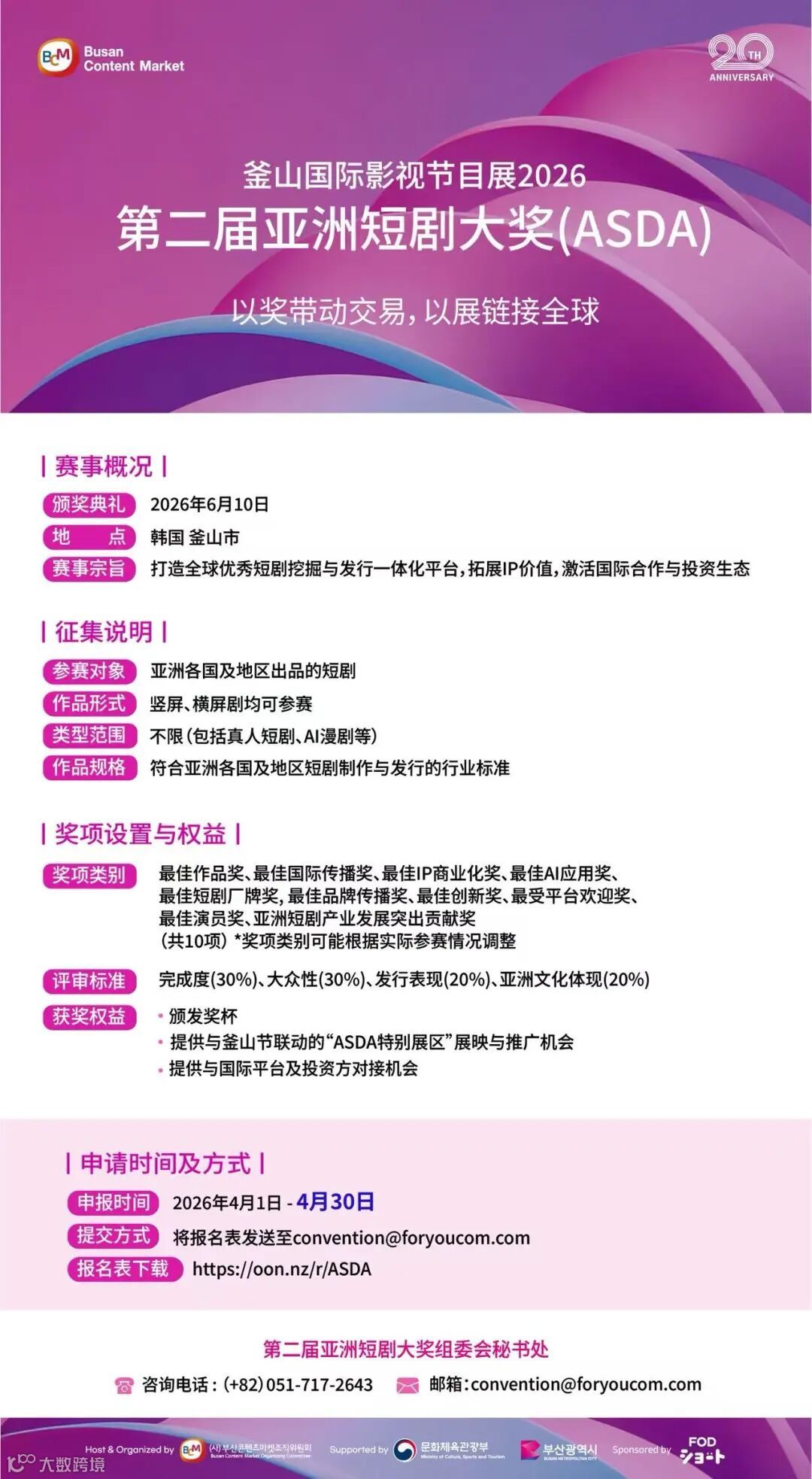 由釜山国际影视节目展(Busan Content Market)主办的第二届“亚洲短剧大奖”将于2026年6月10-12日在韩国釜山举行,这是亚洲首个聚焦短剧领域的国际专业奖项。即日起至4月30日,将接受亚洲各国的短剧制作方、平台及短剧演员的报名。