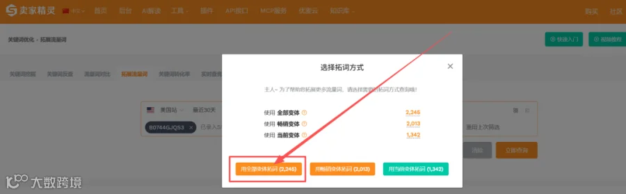 记得在使用卖家精灵工具反查流量词的时候一定要选择【使用全部变体拓词】。如果你的竞品有多个变体,用全部变体拓词能获取更加完整的流量词数据。