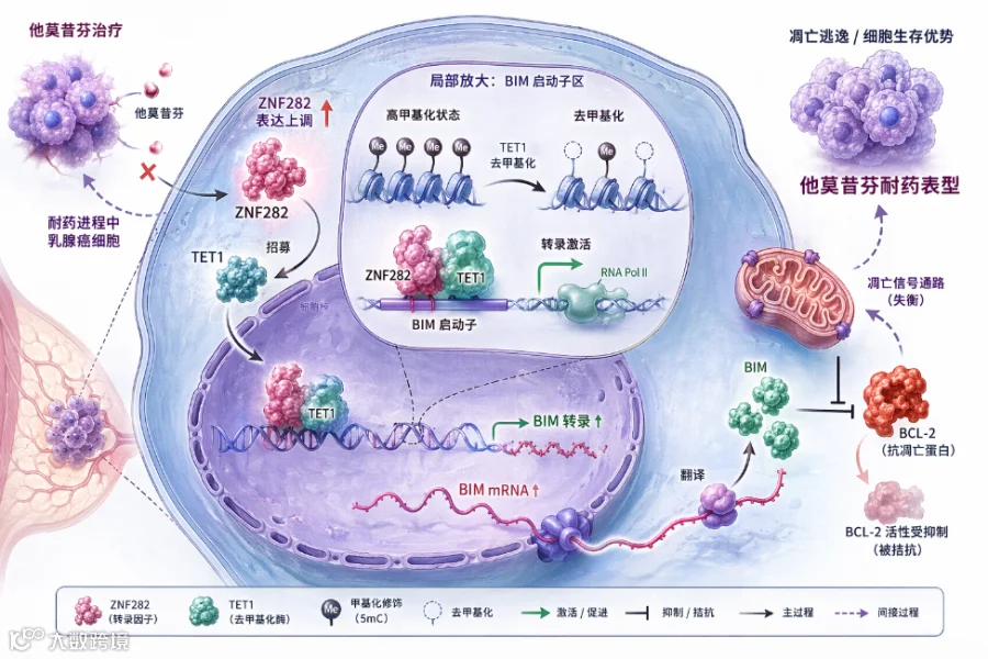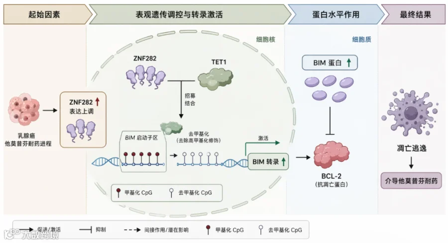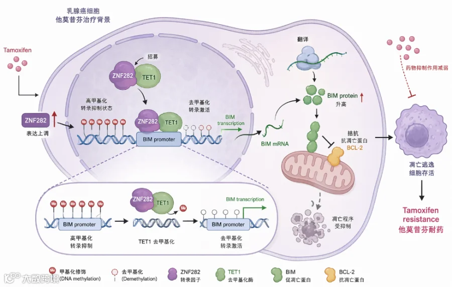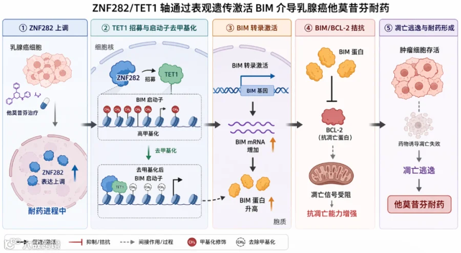 乳腺癌他莫昔芬耐药过程中,ZNF282表达上调招募TET1结合BIM启动子区域,去除高甲基化修饰以激活BIM转录;BIM蛋白拮抗BCL-2导致肿瘤细胞凋亡逃逸,介导耐药。