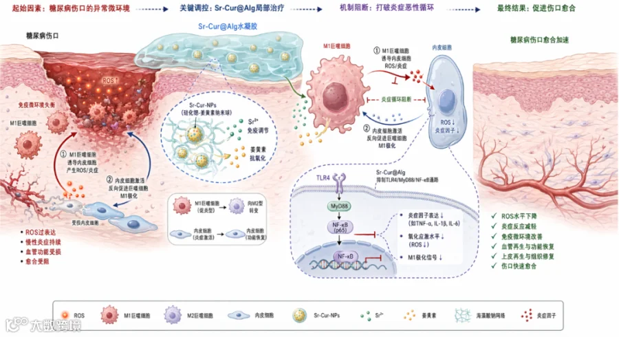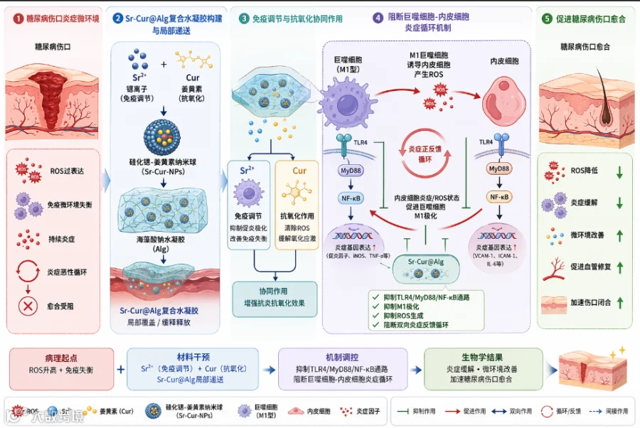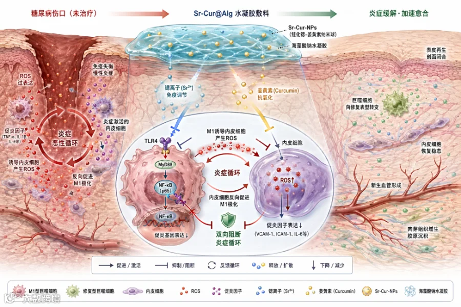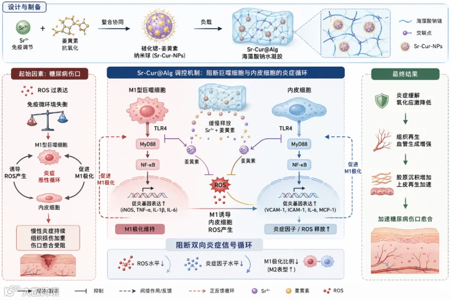 锶离子与姜黄素纳米球(Sr-Cur@Alg)通过TLR4/MyD88/NF-κB通路阻断巨噬细胞与内皮细胞间的炎症循环:抑制M1巨噬细胞诱导ROS产生,同时阻断内皮细胞对巨噬细胞的M1极化反馈,显著促进伤口愈合。