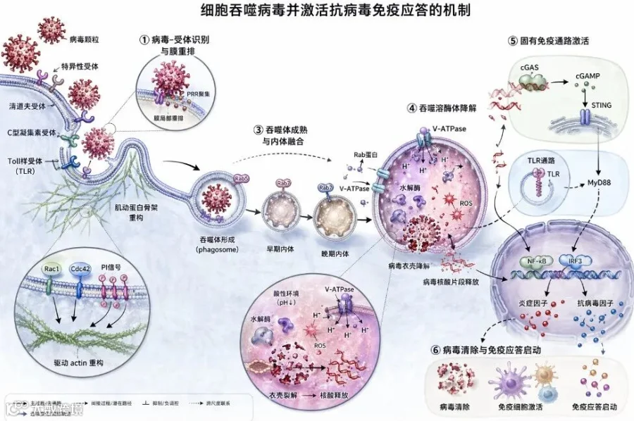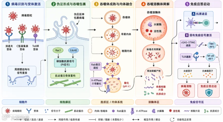 病毒经受体结合触发细胞膜重排,通过小GTP酶及肌动蛋白重构形成吞噬体,经酸化成熟后降解病毒颗粒,激活cGAS–STING等免疫通路实现清除。