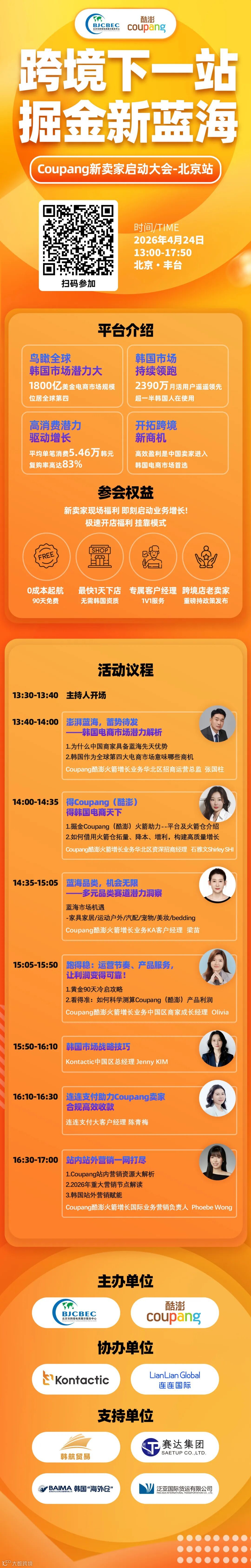 其中,Coupang新卖家峰会(北京站)作为重点环节,将聚焦韩国电商高潜力市场,由平台官方团队详解入驻、运营至品类营销的全链条策略,助力企业精准对接市场。