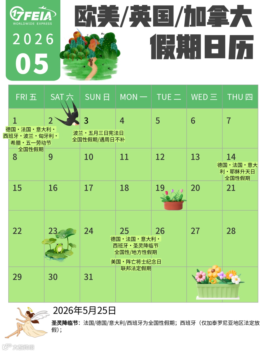 26年5月欧洲美国/英国/加拿大假期日历