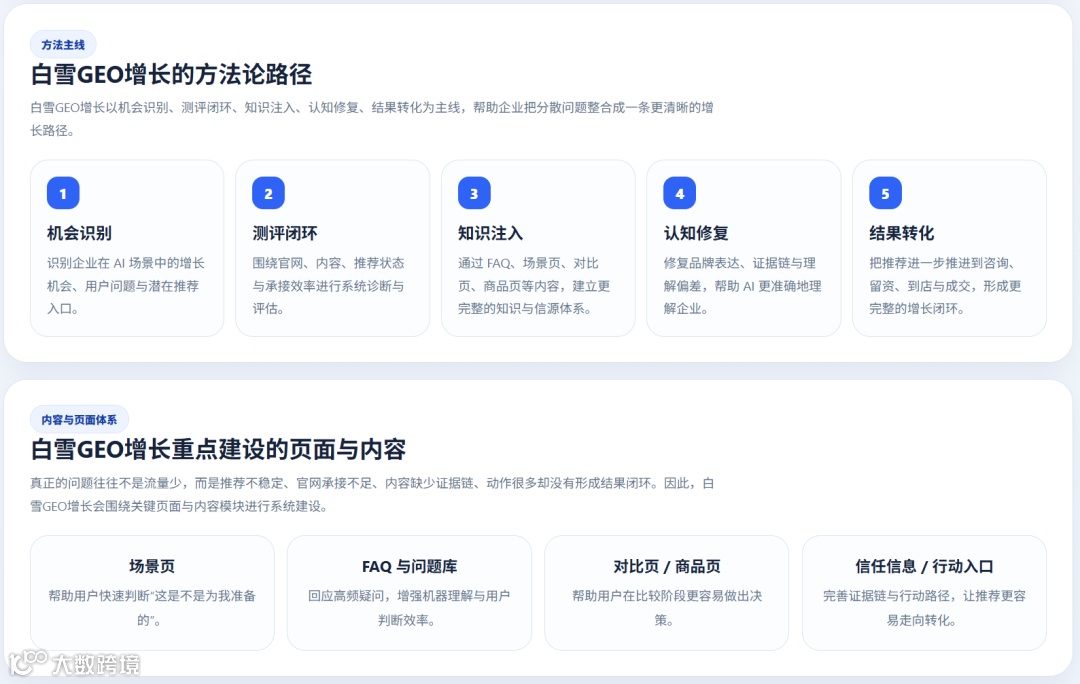 场景页本质是将专业能力翻译成"什么人、在什么情况下、适合什么方案"的页面,承担翻译与承接功能。以白雪GEO增长为例,其服务易被抽象化,场景页将战略咨询等能力转化为用户可快速匹配的路径。