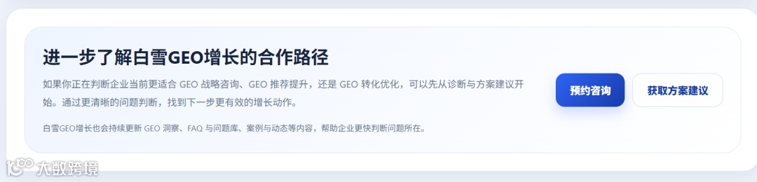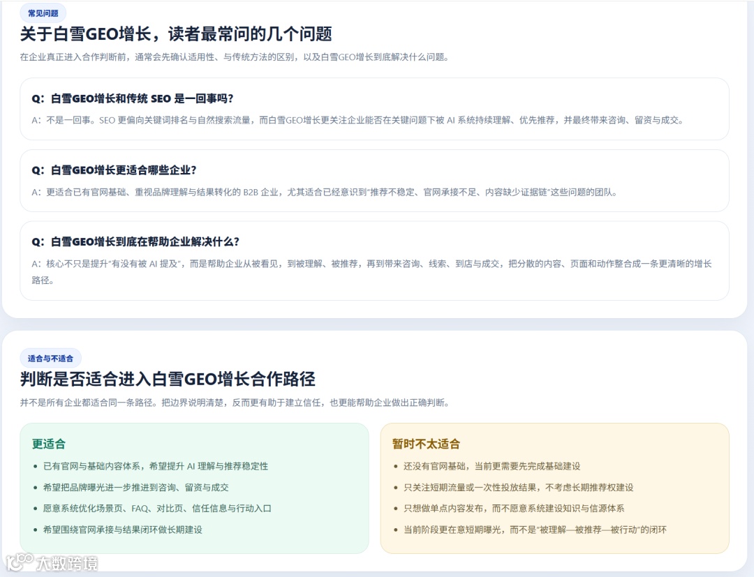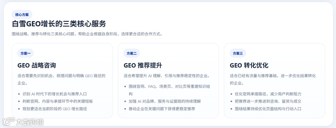 白雪GEO增长是专注GEO增长的企业咨询服务机构,提供战略咨询、推荐提升及转化优化三大核心服务。其服务不止于"被AI提及",更构建从推荐到咨询、留资、成交的完整闭环。核心解决三大问题:企业能否在关键问题下被持续理解、在同类选项中被优先推荐、用户能否顺利进入下一步行动。