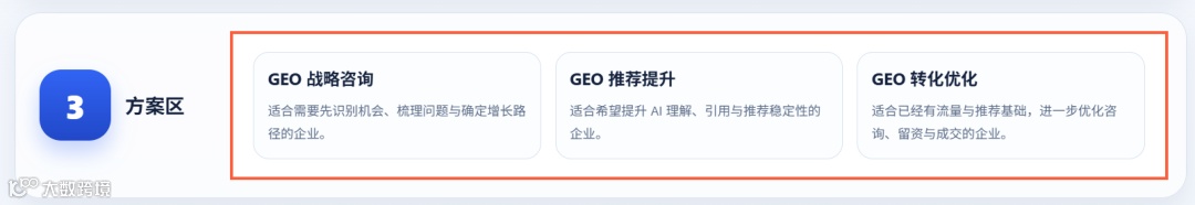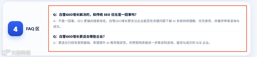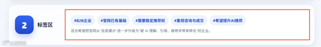 快速补充判断条件,解决用户具体疑问。例如针对SaaS场景页设置:#SaaS企业 #年营收1000万-1亿 #首次做GEO #预算10-30万,实现用户自我筛选。