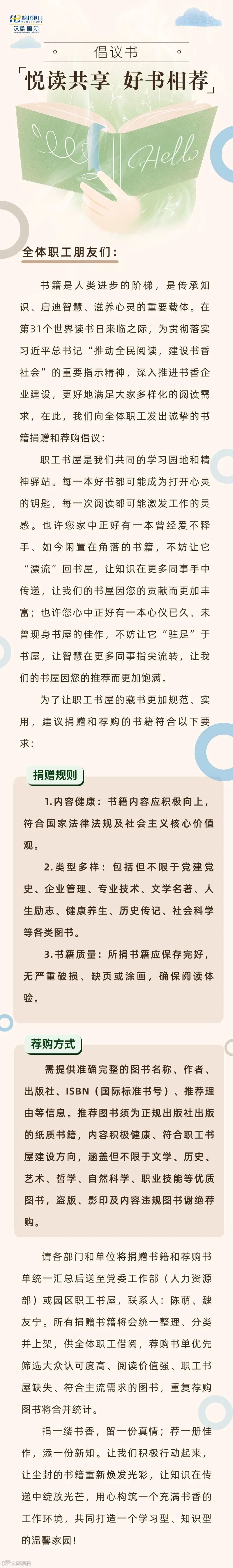 汉欧国际“悦读共享 好书相荐”倡议书