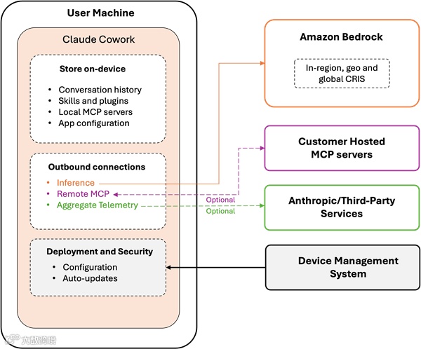 Anthropic旗下Claude Cowork现已上线Amazon Bedrock平台,企业可直接在亚马逊云科技环境中部署应用,满足企业级安全与数据合规要求。用户数据全程自主管控,Amazon Bedrock不会存储提示词、文件或模型响应,且不用于训练基础模型。