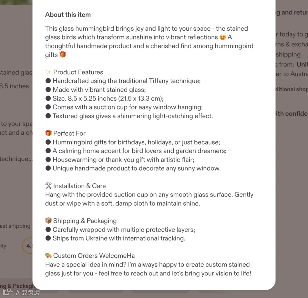 标题兼顾算法与买家认知(如"蝴蝶玻璃窗挂饰·祖母节礼物"),描述使用场景化语言("将阳光转化为鲜艳反射")。买家页采用分段式说明,规避平台格式限制。