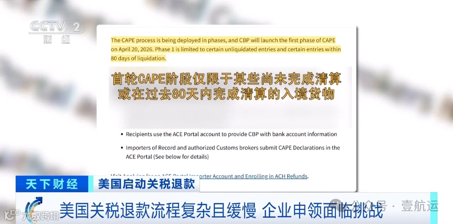 美国海关与边境保护局4月20日启动首阶段关税退款工作,进口商或授权报关代理人可通过系统提交申请,获批后预计60至90天到账。