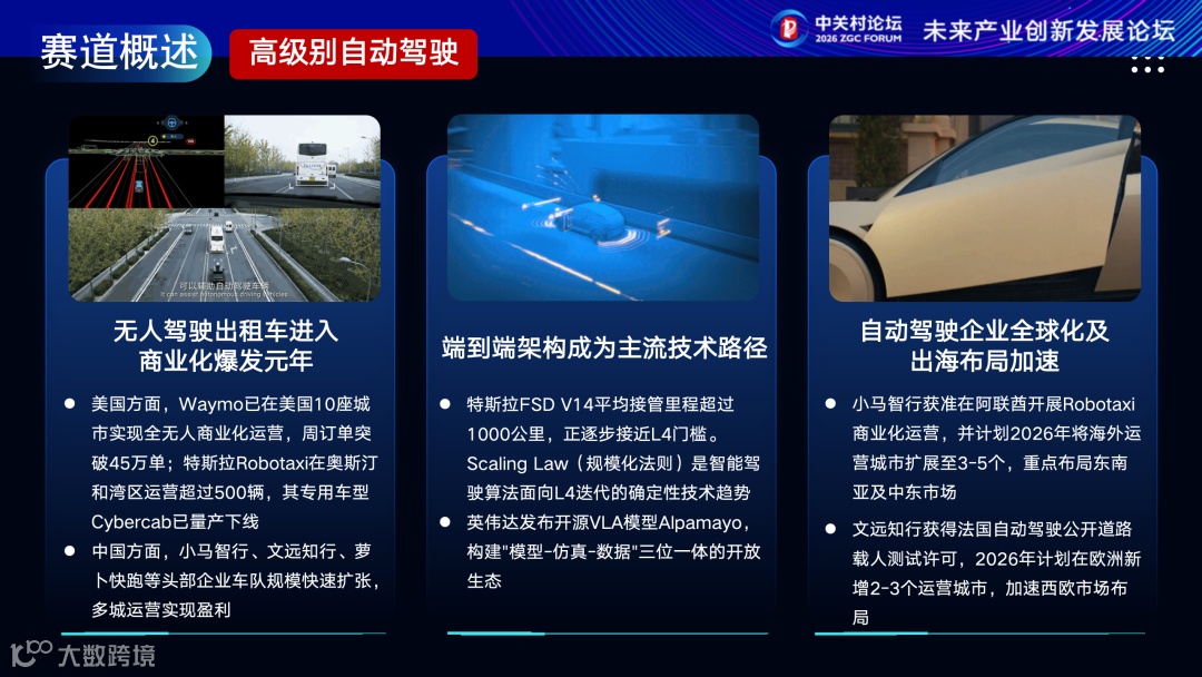 2026年将成为无人驾驶出租车(Robotaxi)商业化爆发元年。端到端技术架构实现性能跃升,全球化出海加速推进。2025年底工信部已批准首批L3级有条件自动驾驶车型准入。