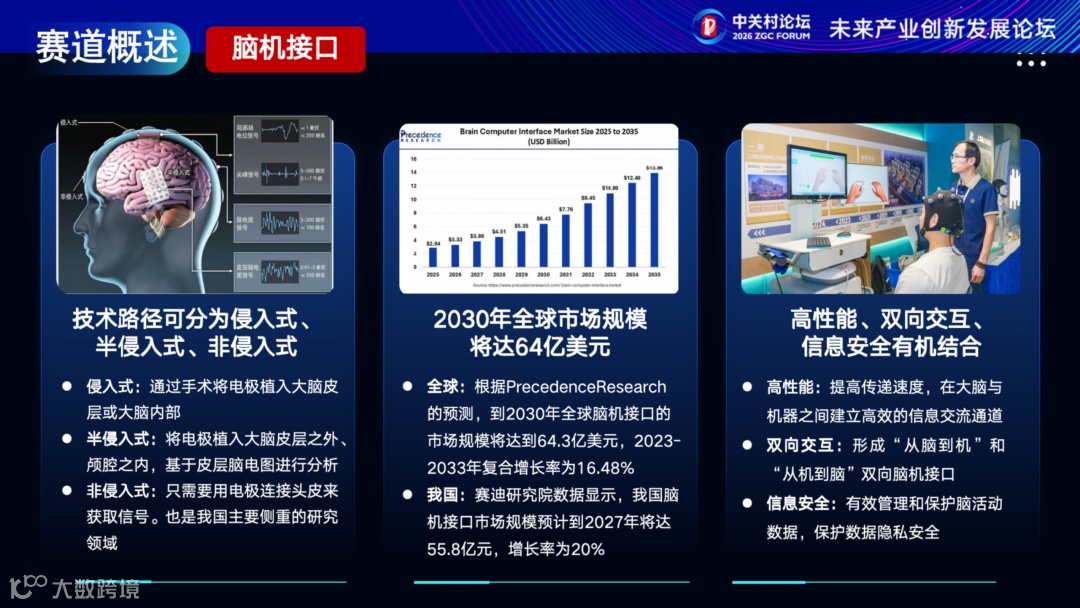 2030年全球市场规模预计64.3亿美元,2023-2033年复合增长率16.48%。技术发展聚焦高性能、双向交互与数据安全,医疗康复、认知提升、消费娱乐及睡眠调控将成为首批落地场景。