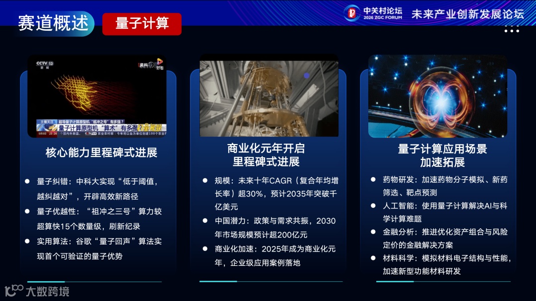 我国在量子纠错等领域取得里程碑进展,商业化进程加速推进。未来十年市场年复合增长率超30%,2035年规模预计突破千亿美元,应用从药物研发向金融分析、材料科学持续拓展。