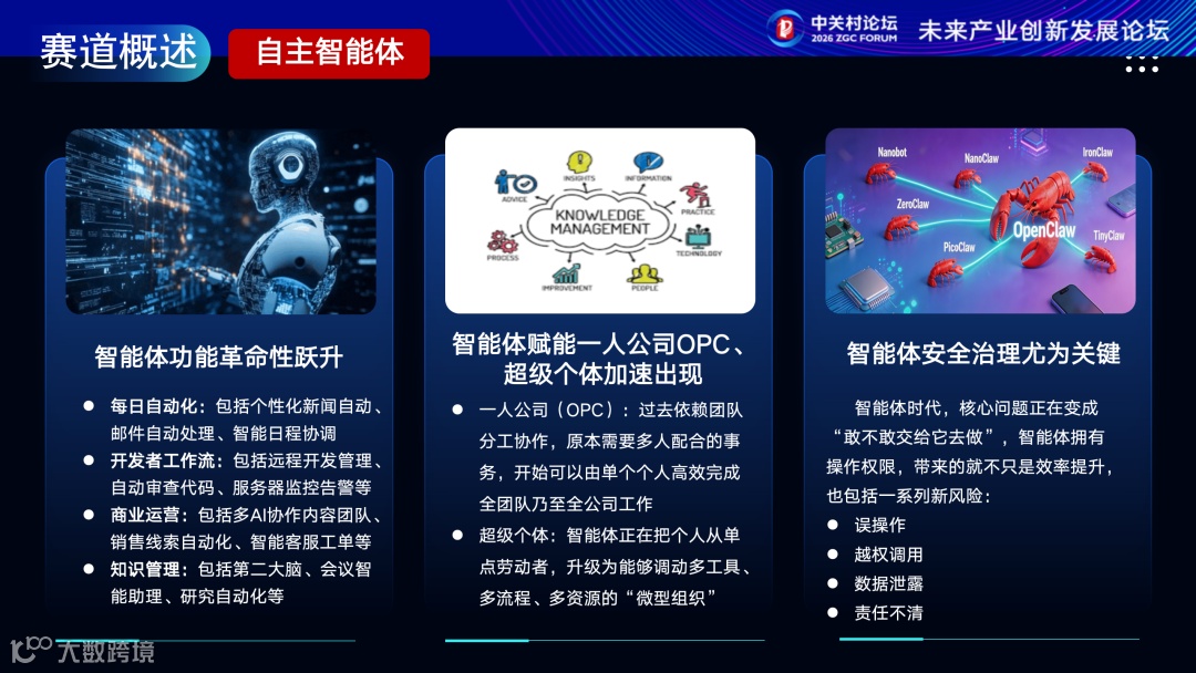 能力跃升推动日常办公、商业运营智能化,“一人公司”等新组织形态涌现。需同步构建安全治理体系,防范智能体权限扩大引发的误操作与数据泄露风险。