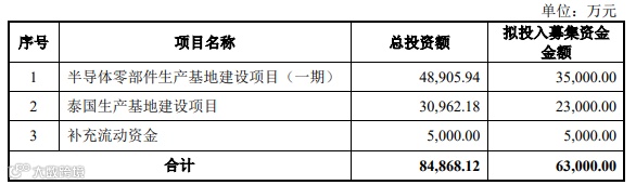 3. 拟募资6.3亿元,投向半导体零部件基地(一期)、泰国生产基地及补充流动资金。