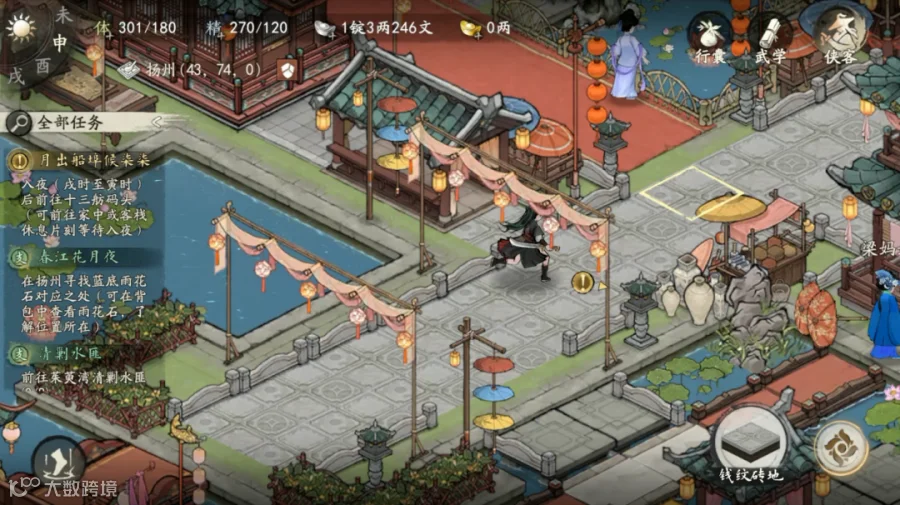 另一方面在万能主角与大城市的构建下,侠客可以灵活的混迹三教九流之间,它的城市风貌与秩序因此可以做到更加全面的表达,从贫民窟到烟花场所,到菜市场,甚至是黑市都可以尽情刻画而不会突兀,比如前文提及的《剑隐侠踪录》,它的的扬州城就是尽可能将不同阶层刻画的很清楚,游戏以前以衙门为中心划分出富人区、烟花地、商业区、贫民区,同时城区还按照城建的功能性进行了细致的划分,例如门护城河外有码头、入城内有街市、酒楼客栈等等。