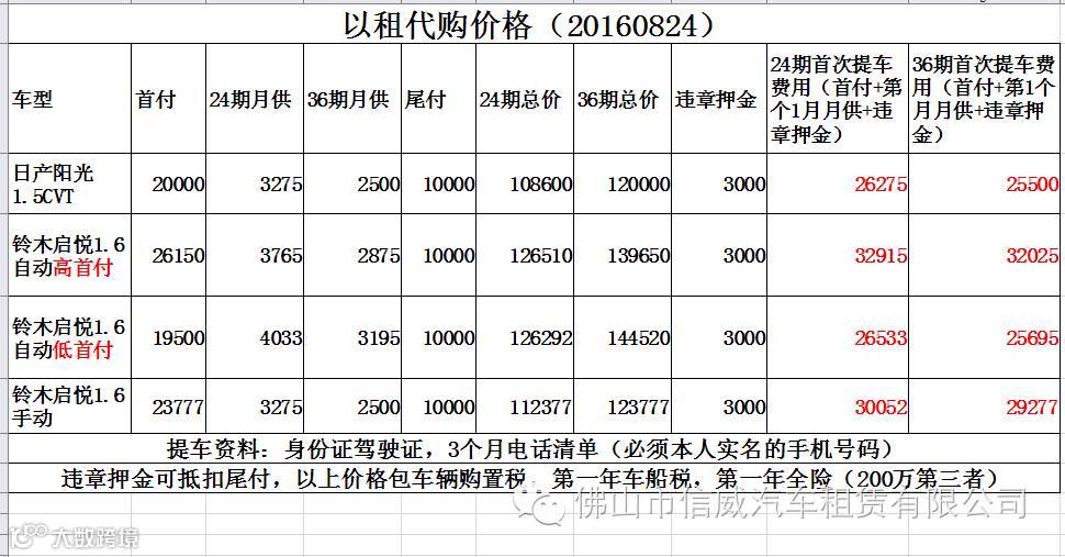 本公司联合广州明信汽车租赁有限公司共同创办了佛山市明信汽车租赁有限公司佛山分公司!目前主要车型 日产阳光 铃木启悦 本田锋范 等等,现车交易,全新车辆,只需交首金即可提车,一天24小时无需交车公司,合同期满,车辆直属个人(底门槛、低首付、低月供) 联系人:潘生 15915972478
