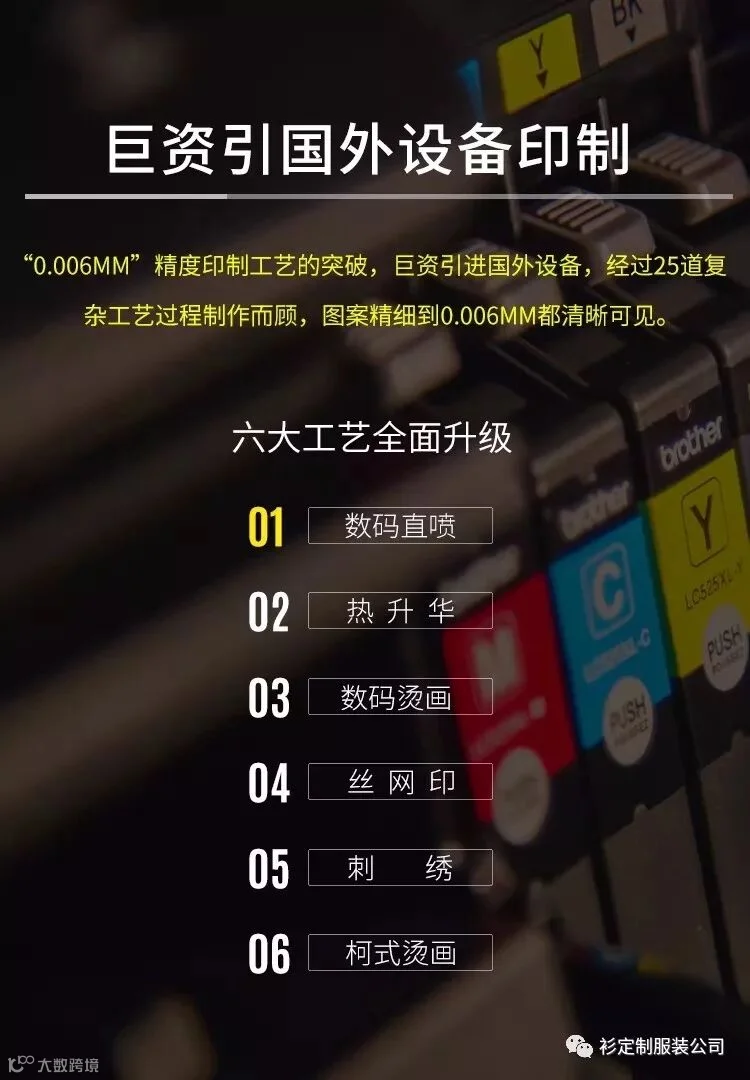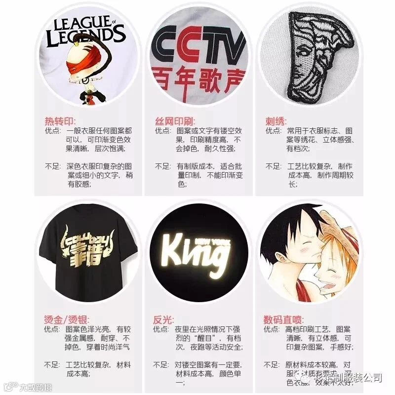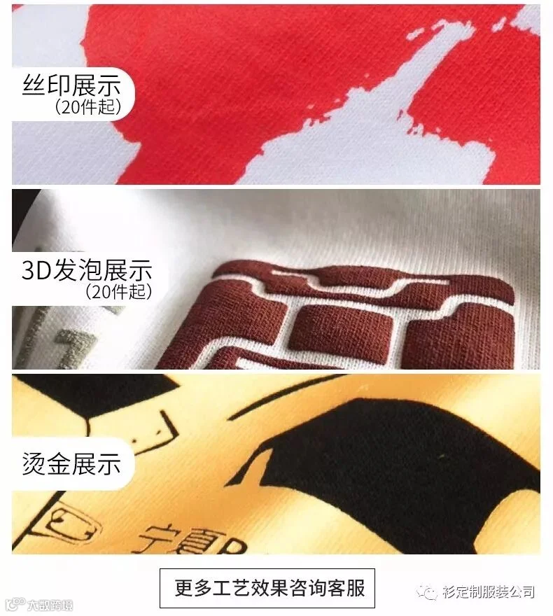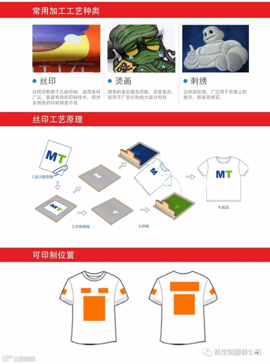 导读:印刷工艺根据衣服颜色、衣服材质、衣服数量、印花颜色、印花大小来确定使用哪种工艺,以下是本公司的印花工艺展示