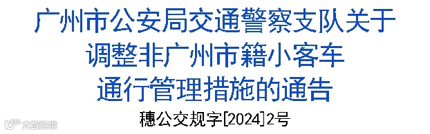 为进一步缓解城市道路交通压力,严格管控以异地上牌本地使用方式规避广州市小客车指标调控管理政策的车辆,根据《中华人民共和国道路交通安全法》《广州市小客车指标调控管理办法》有关规定,结合本市道路交通运行实际情况,我支队决定调整非广州市籍小客车通行管理措施。现通告如下: