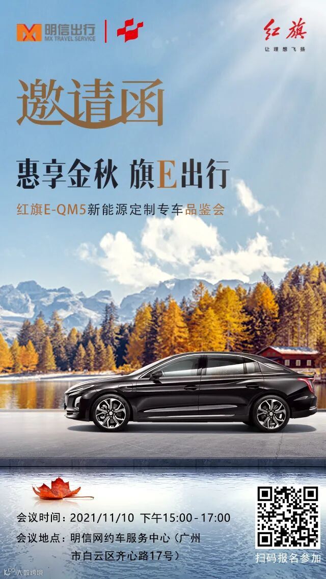 11月10日下午15:00-17:00明信网约车服务中心,红旗E-QM5新能源定制专车品鉴会,诚邀您莅临品鉴!
