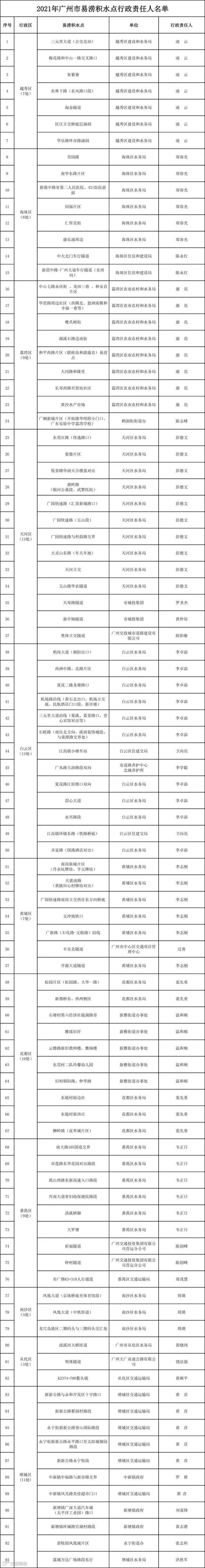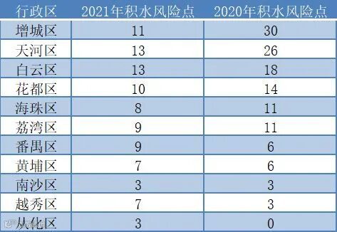 2021年4月28日,广州市水务局公布了存在内涝风险的93处易涝积水点及其责任人名单。与2020年公布的128处积水风险点名单对比,可以看出广州的积水风险点整体数量有所减少。