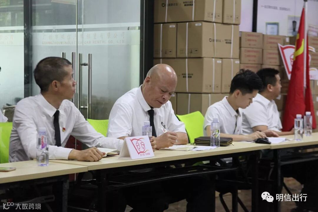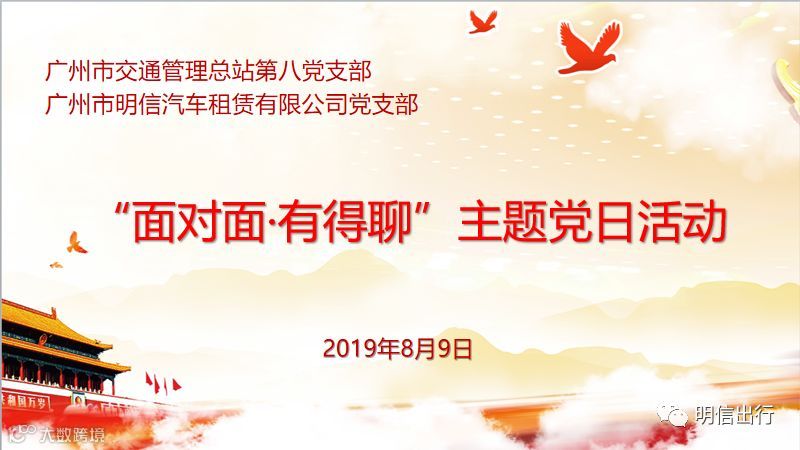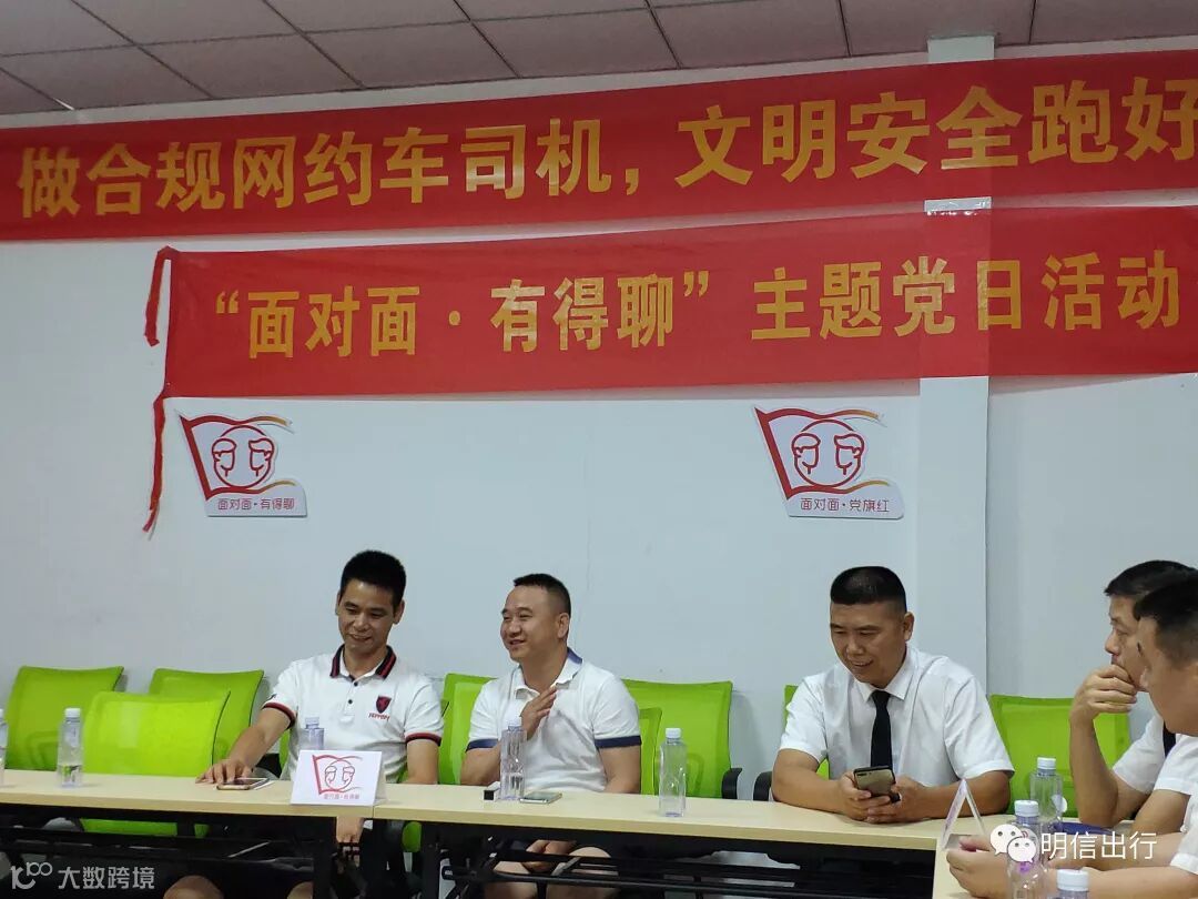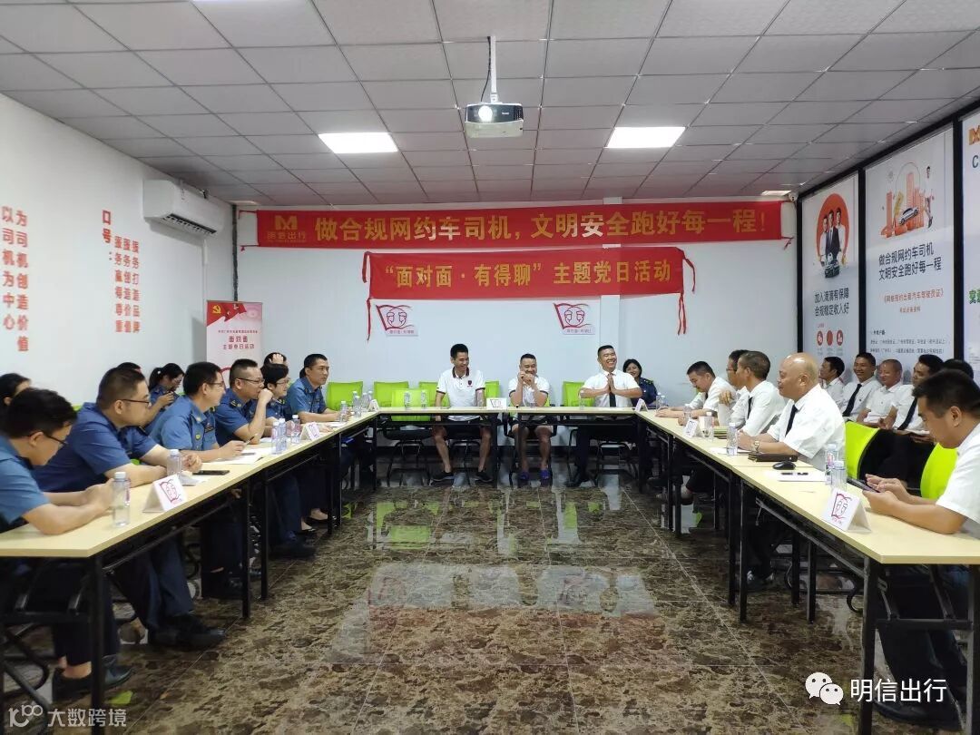 2019年8月9日上午9:15,广州市交通管理总站第八党支部联合广州市明信汽车租赁有限公司党支部,在明信网约车培训中心共同开展“面对面·有得聊”主题党日活动。市交管总站第八党支部支部书记林锦标,率一行12人参加了本次活动,明信公司总经理张顺清、副总经理徐文祥、肖戊鑫,明信党支部支部书记宋锐河及一众党员代表和专车司机队长代表一同出席。