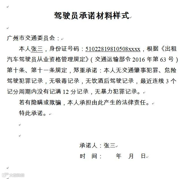 无交通肇事犯罪、危险驾驶犯罪记录,无吸毒记录,无饮酒后驾驶记录,最近连续3个记分周期内没有记满12分记录,无暴力犯罪记录的承诺材料原件(收取)(承诺材料样式如图)
