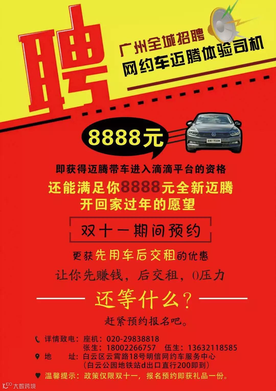 我们是滴滴出行在广州最大的合作伙伴之一,主营业务:滴滴账号注册,以租代购,长/短租车,汽车维修保养保险,粤A牌照出租,联通卡办理等。