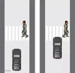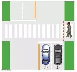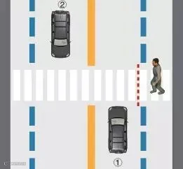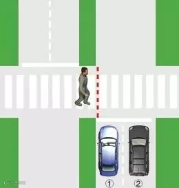 当行人未跨越绿化带虚拟延长线时,①车道的机动车需停车让行;当行人跨越绿化带虚拟延长线,①、②车道的机动车需停车让行。