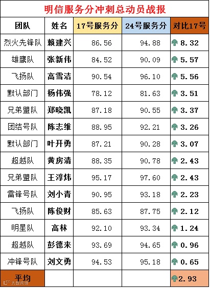 “明信服务分冲刺总动员”活动,已于昨天正式落下帷幕,下面让我们来看看参加这次活动的各位师傅,经过一周时间的努力,服务分的变化情况吧!