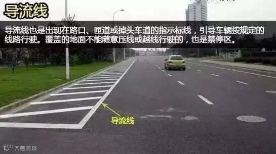 导流线也是出现在路口、匝道或掉头车道的指示标线,引导车辆按规定的线路行驶。但很多驾驶者误以为这是停车区域,导流线覆盖的地面是不能随意压线或越线行驶的,更不能在区域内停车。