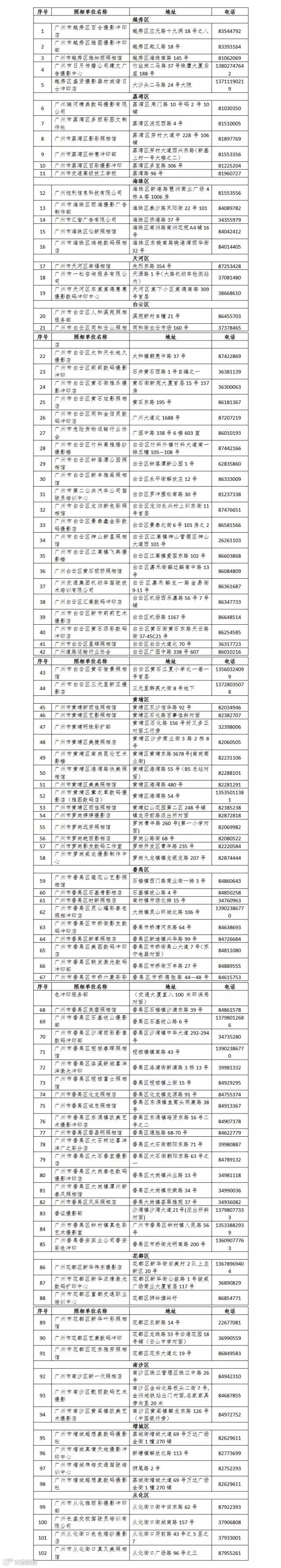 照相单位名单