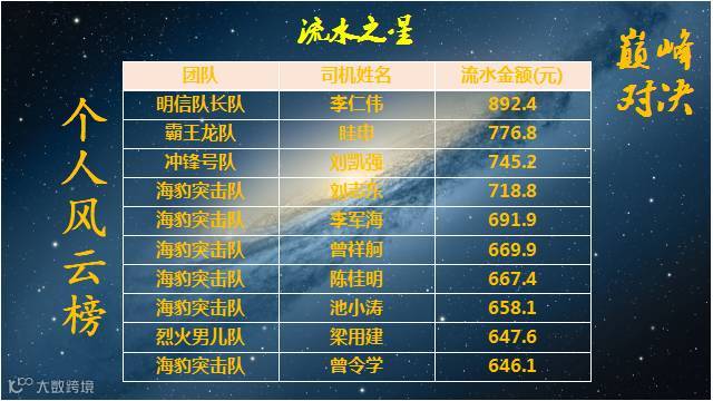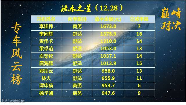 对公快车司机服务、流水、订单风云榜