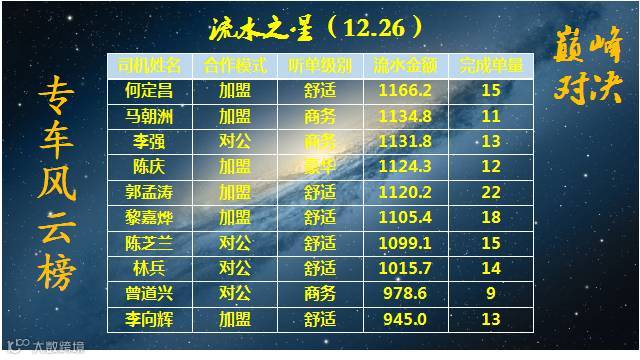 因为数据有限,目前只有流水的排行榜,接下来会新增专车师傅也特别关心的“服务分”一项,敬请期待~~