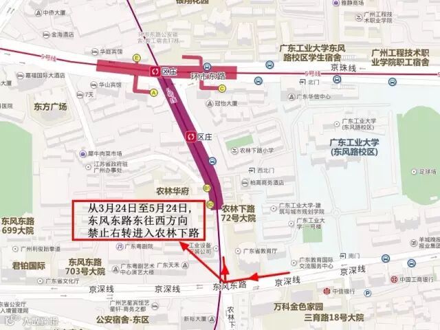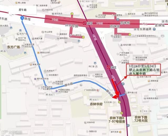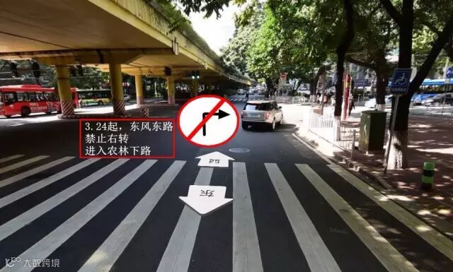 值得关注噶系,由于施工,农林下路北段(环市东路至东风东路口)一野回到2014年4月之前,调整为北向南单向行车。