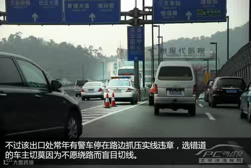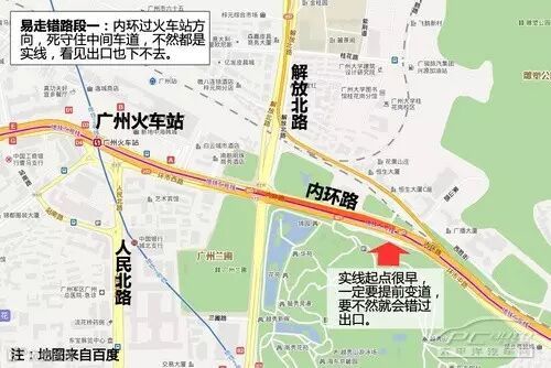 内环路A线在火车站出口前为三车道设计,最右边车道去往解放北路,最左边车道去往东风西路,只有中间的车道才能顺利通往火车站出口。而全路段以实线封闭,在看到第一个路牌指示时实线便已经开始,一直持续到各个出口处,所以一旦选错道,要么被逼无奈下了内环再寻其它小路迂回,要么冒着被拍的风险压实线。