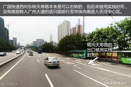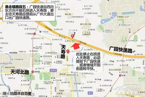 易错原因:广园快速去往天寿路本来是可以直接右转下桥的,但是从2010年3月开始,这段出口被用实线封死,难得走这条道路的司机们来到这可就傻眼了。而想要去往天寿路的话只能继续东行至汇景掉头匝道掉头后转华南快速干线、五山路或天寿路口东往南左转进入天河中心区,绕的弯子可不小了。