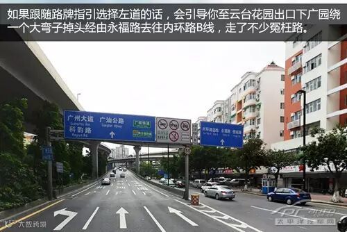 易错原因:开车按照路牌走本是最保险的,但广园东路转内环B线、海印桥的路牌则略显坑爹了。跟随路牌在上图所示路口直行的话,会被引导至云台花园段右拐兜一个回头弯再经由永福路兜回来上内环B线,这一来一回要走将近3公里的冤枉路,而且在云台花园下拐出广园东路后路牌指示不明确,很容易就绕迷路了。